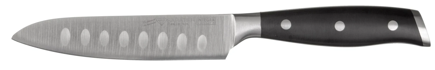 Ben jij opzoek naar het ideale allerhande mesje voor in de keuken? Het Officemes is ideaal om allerhande kleine snij taken uit te voeren. Deze messen worden veel geroemd door koks om hun grote veelzijdigheid. Dit officemes uit de Diamant Sabatier Integra serie heeft een lemmet van 12 cm en beschikt over kuiltjes. Deze kuiltjes zorgen ervoor dat etenswaren minder snel aan het lemmet blijven plakken.