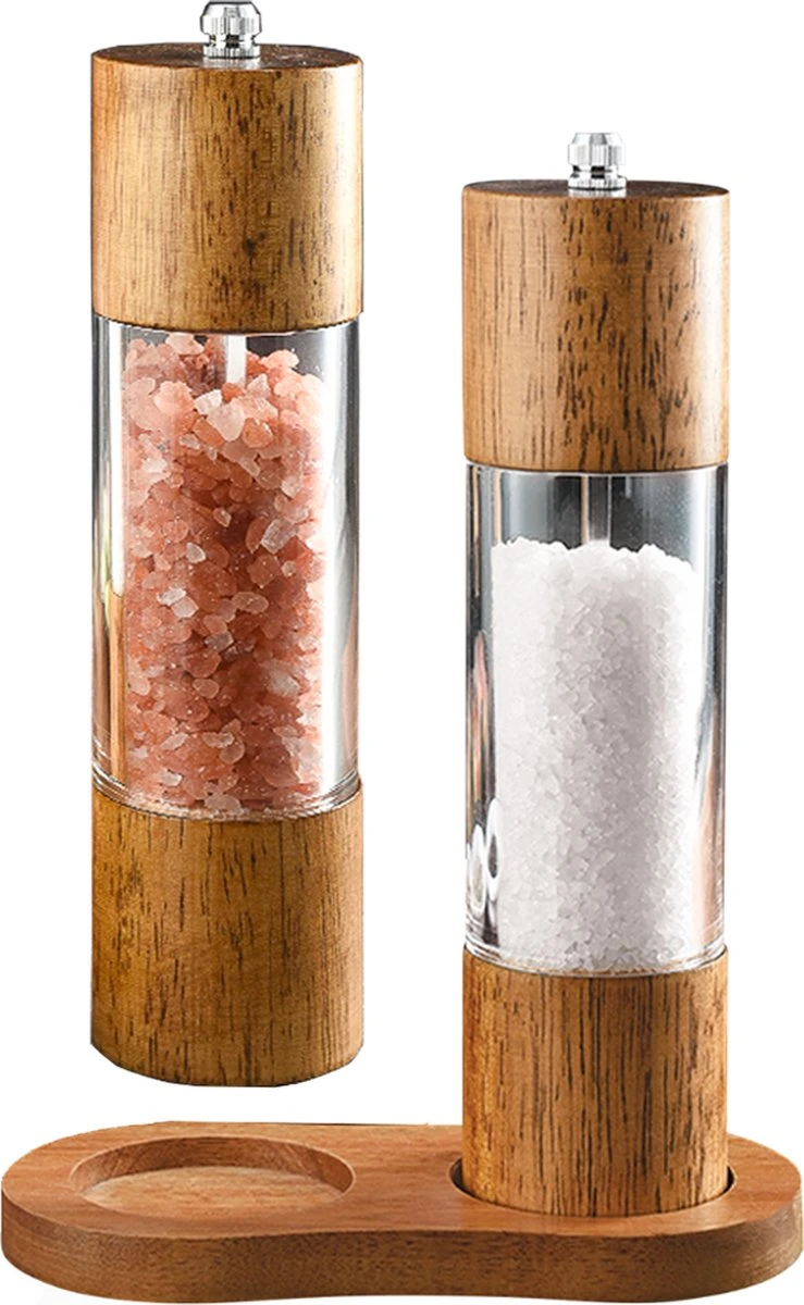 Het peper en zout stel is gemaakt uit hoogwaardig transparant acryl, acaciahout, roestvrij staal, en heeft een keramisch maalwerk. Het keramisch maalwerk is vervaardig uit extreem hard gebakken keramiek dat zo slijtvast is dat zelfs de hardste kruiden en mineralen vermalen worden zonder problemen gemalen worden. De zorgvuldig uitgekozen materialen houden de molen geur- en smaakvrij. Via de roestvrij stalen bovenzijde is de molen naar wens traploos verstelbaar van zeer fijn tot zeer grof.